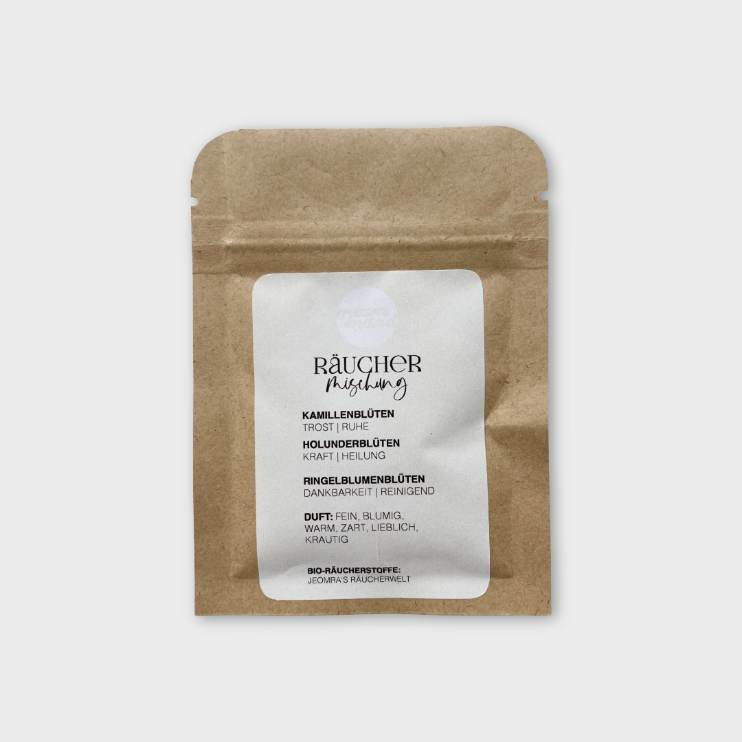 Die Bio-Räucherstoffe kommen von Jeomra‘s Räucherwelt, diese mische ich liebevoll von Hand und fülle sie in kleine Glasfläschen mit Korken.