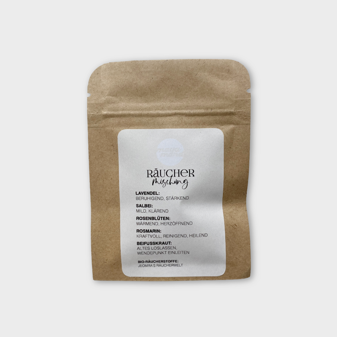 Die Bio-Räucherstoffe kommen von Jeomra‘s Räucherwelt, diese mische ich liebevoll von Hand und fülle sie in kleine Glasfläschen mit Korken.